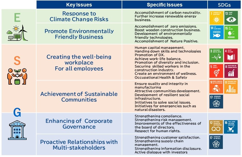 Kumagaigumi formulated “ESG Initiative Direction” as an elemental policy, in 2019. In addition, we specified Key issues (materiality) and Specific issues. In May 2024, we specified Key issues again considering recent social trends. In the same time, we revised Specific issues that are risks or opportunities with a medium to long-term perspective in mind.