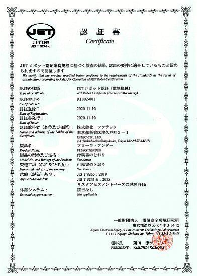 福祉用具の多くは、JISに構造や安全に関して規定されています。「フローラ・テンダー」は、歩行車に立ち上がり補助機能を付加した製品ですので、それらを規定する単一の規格はありませんでした。そこで、お客様により安全にお使いいただけるよう、複数のJIS規格※2とリスクアセスメントに基づいて、福祉用具として国内で初めて一般財団法人電気安全環境研究所(JET)のロボット安全認証※3を取得しました。