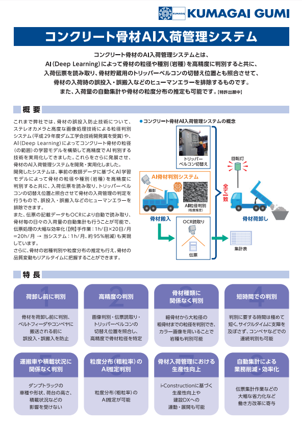 AIにより骨材の粒径や種別(岩種)の判別を行い、骨材の入荷時の誤投入・誤搬入などの入荷管理を行うシステム