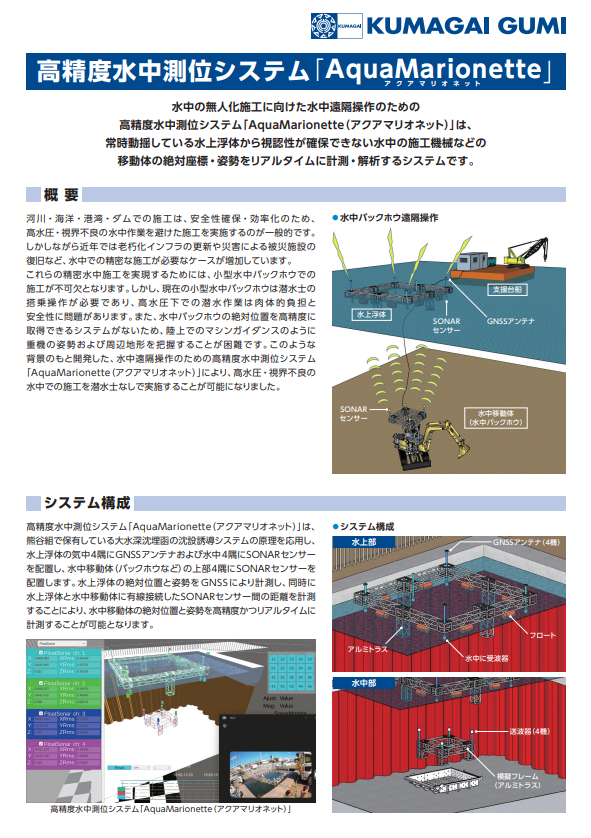 視認性が確保できない水中施工機械等の移動体の、絶対座標・姿勢をリアルタイムに計測・解析するシステム