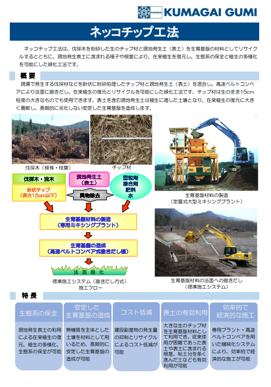 伐採木を破砕した生チップ材と、現地発生土(表土)を緑化基材として利用し、在来植生の復元と生態系の保全を図る工法